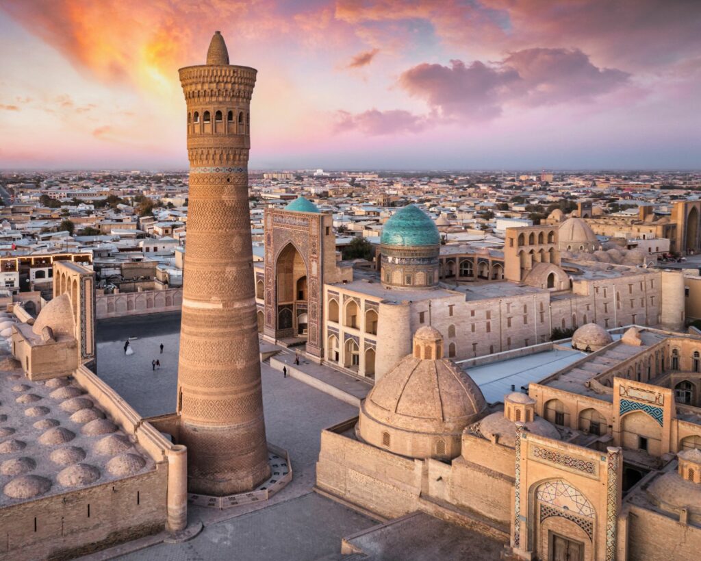 Entre les coupoles turquoise de Samarcande, les ruelles anciennes de Boukhara et les marchés colorés où les épices chatouillent le nez, le pays dégage une ambiance chaleureuse et hors du temps. On ressent le passé de la Route de la Soie à chaque pas, et les habitants vous accueillent avec le sourire et une grande générosité.